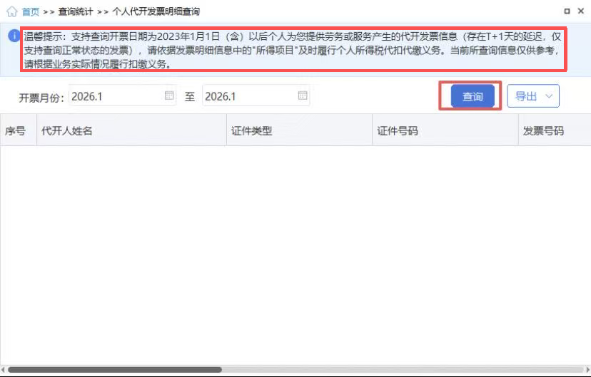 企业可查询 2023 年 1 月 1 日之后,个人为企业代开发票的全部详细信息,其中【所得项目】一栏会直接明确企业是否需要代扣代缴个人所得税,以及具体的代扣代缴申报要求,降低应扣未扣风险。