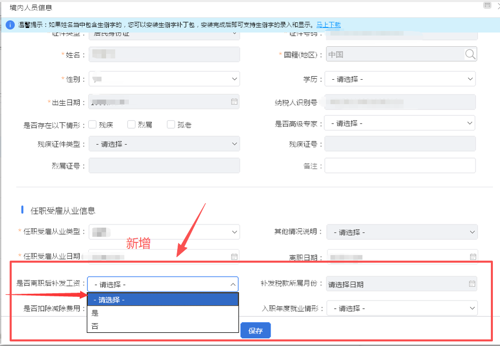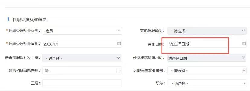 选择【离职日期】,在是否离职后补发工资选择【是】或者【否】。假如该员工是2026年2月28日离职,2月的工资在3月支付,这时候就需要在这个地方选择【是】,后面的【补发税款所属期】选择2月就可以了。