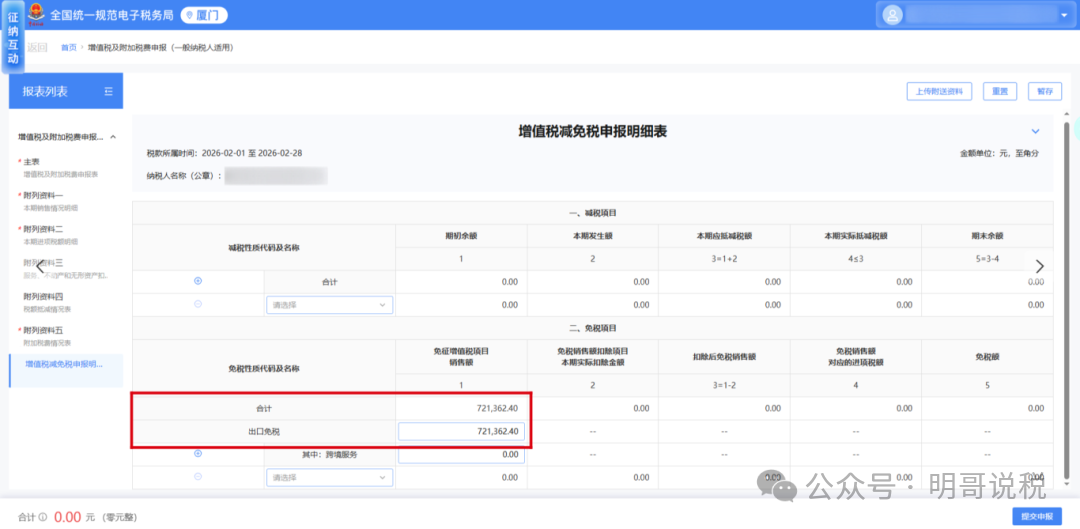 3.填报《增值税减免税申报明细表》“二、免税项目:出口免税”项目。