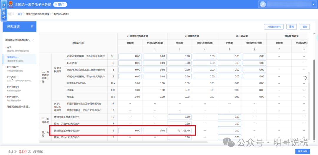 1.将该笔适用免税政策业务的对应销售额填入《增值税及附加税费申报表附列资料(一)》第18栏“四、免税:货物及加工修理修配劳务”项目;