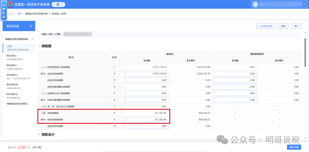 2.同时填报主表《增值税及附加税费申报表》第8-9栏“免税货物销售额”项目。