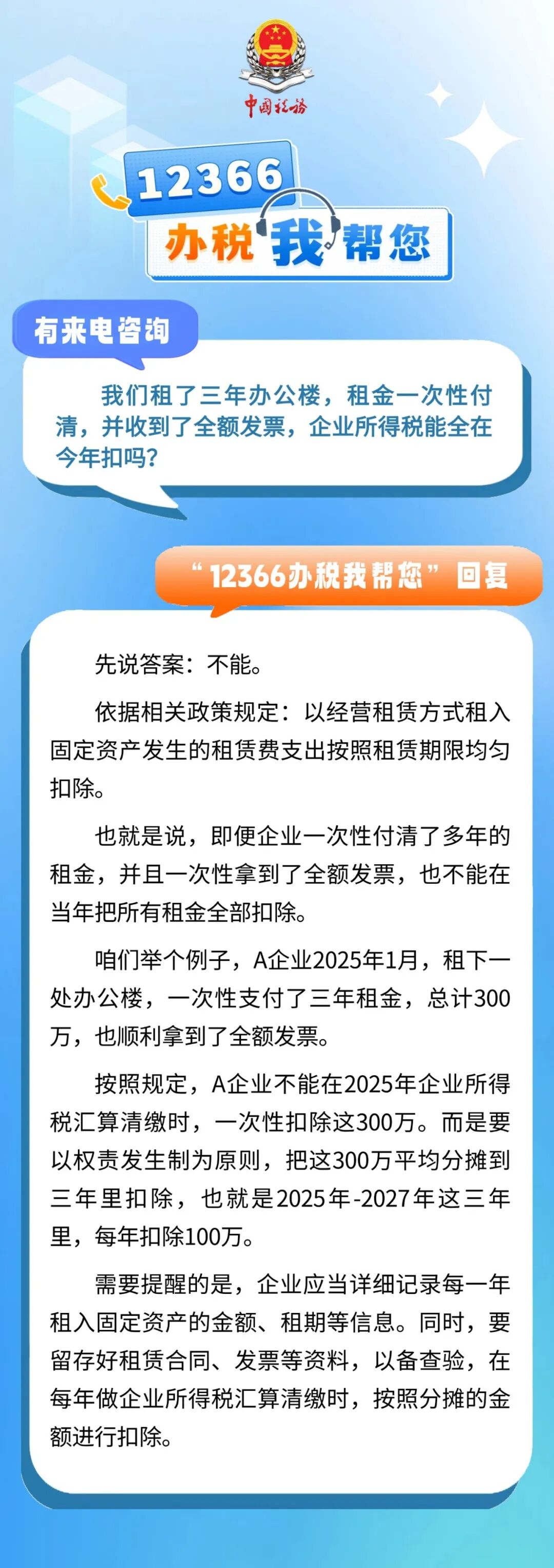有来电咨询 :我们租了三年办公楼,租金一次性付清,并收到了全额发票,企业所得税能全在今年扣吗?一起来看看回复吧↓