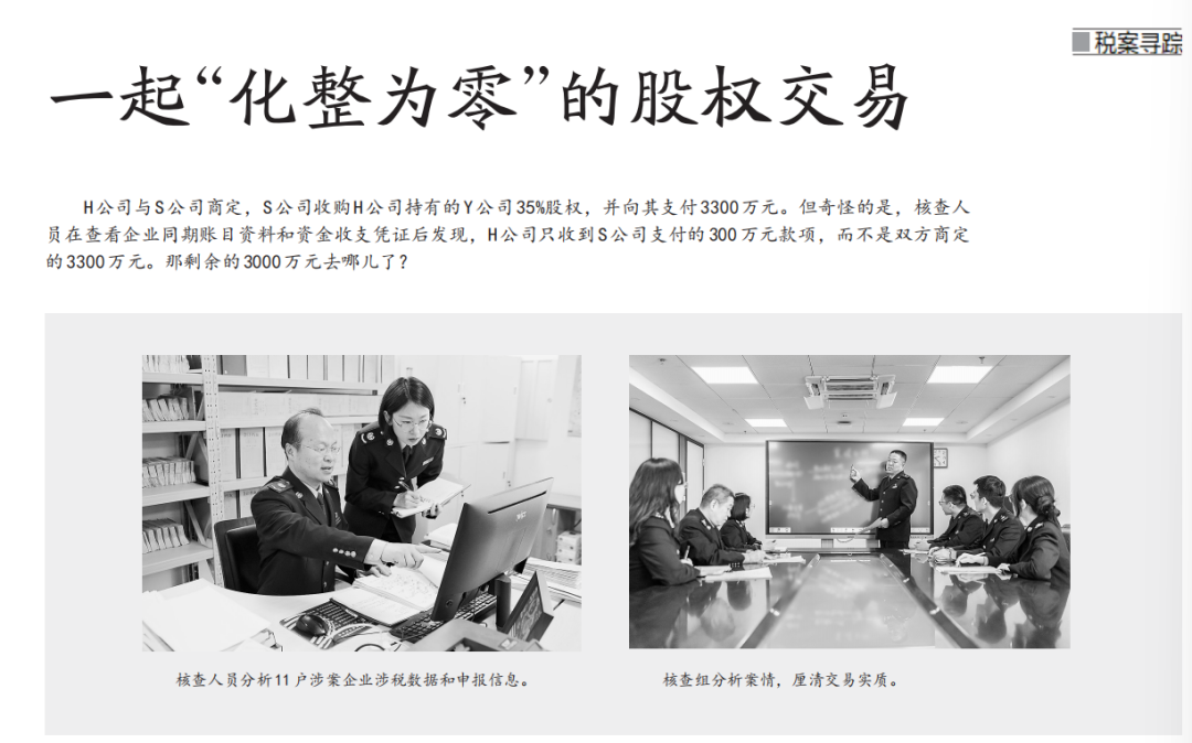 但奇怪的是,核查人员在查看企业同期账目和资金收支凭证等资料后发现,H公司只收到S公司支付的300万元股权转让收入,并不是原本商定的3300万元。那剩余的3000万元去哪儿了?