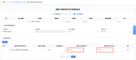 3.录入对应的“减免税土地面积”“月减免税金额”“减免起止时间起始月份”“减免起止时间终止月份”后,填写变更日期,变更时间填写“2025-12-31”,点击“提交”即可完成减免税信息维护。