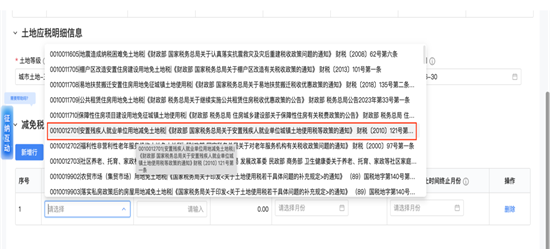 2.点“新增行”,选择“0010012701|安置残疾人就业单位用地减免土地税|《财政部 国家税务总局关于安置残疾人就业单位城镇土地使用税等政策的通知》 财税〔2010〕121号第一条”减免代码。